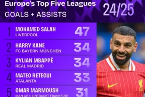 体育资讯5月27日讯 Squawka列本赛季五大联赛球员进球+助攻榜,萨拉赫47球居首,凯恩、姆巴佩34球并列第二。